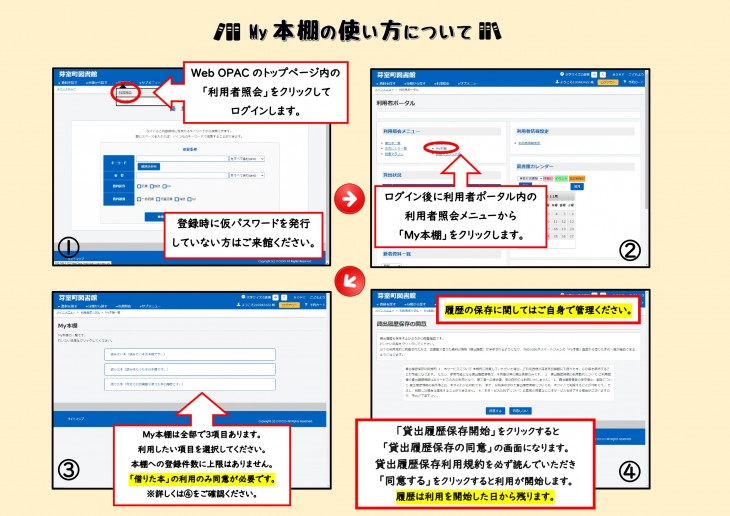 書館に所蔵している本の中から読みたい本や今まで借りた本の履歴を残して自分だけの本棚を作ることができます。