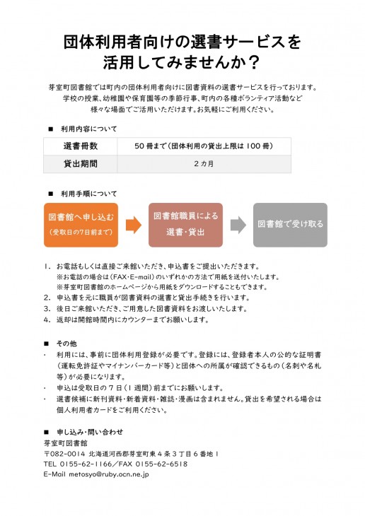 芽室町図書館では町内の団体利用者向けに図書資料の選書サービスを行っております。