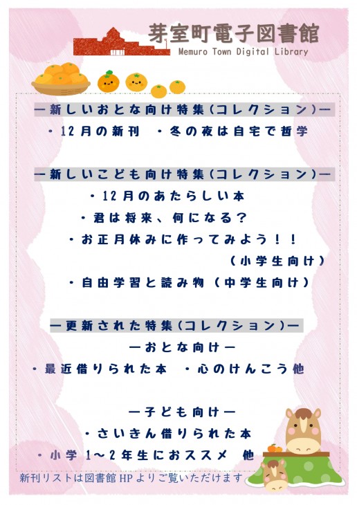 芽室町電子図書館 特集(コレクション)更新のお知らせ(12/22)